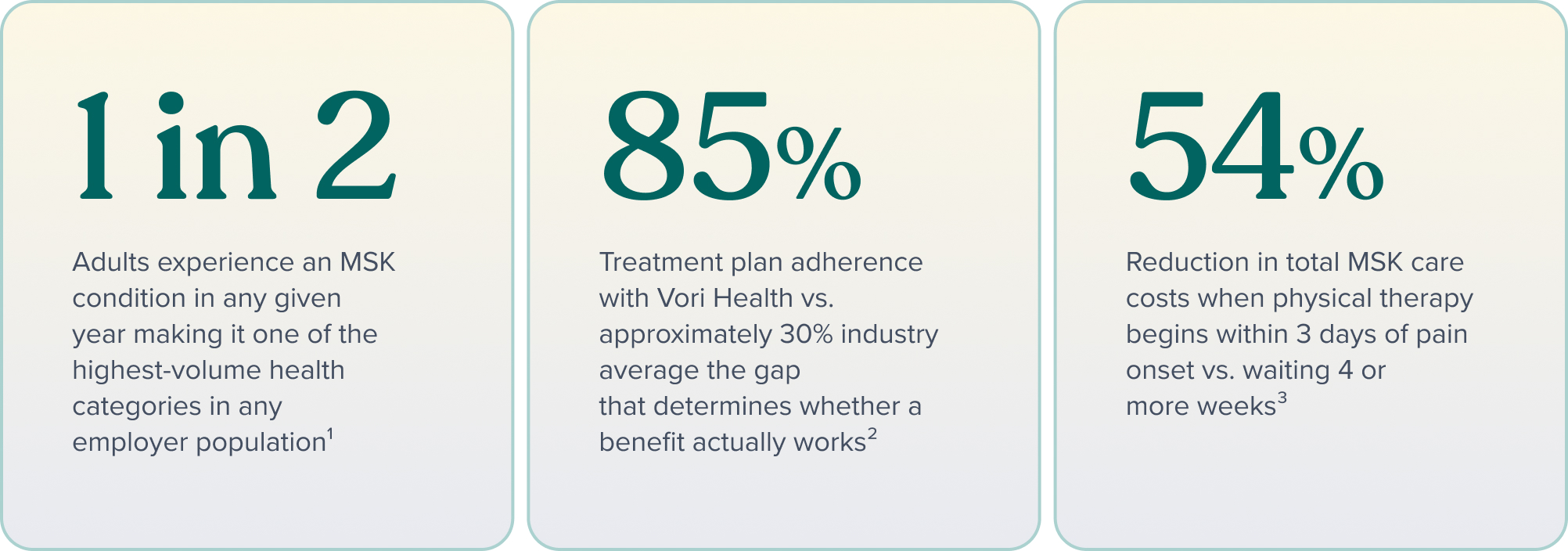 2. Vori Health / Validation Institute (2023). 85% treatment plan adherence vs. ~30% industry average; 97% of members improve without surgery; 78% reduction in surgery vs. traditional care. vorihealth.com/resource/new-validation-institute-report-affirms-vori-health-care-model