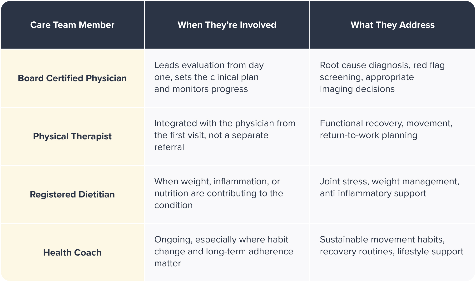 The team, physicians, physical therapists, registered dietitians, and health coaches, works together in-house, coordinating in real time rather than communicating across separate systems and separate schedules.