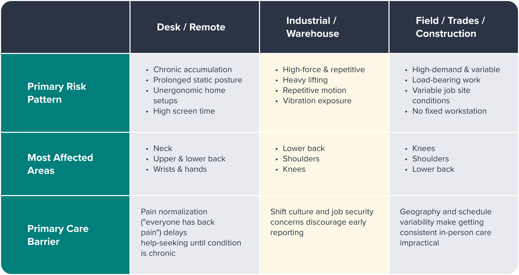 What the aggregate number doesn’t capture is how differently MSK risk manifests depending on the nature of the work. For most benefits leaders, MSK strategy defaults to whichever population is largest or most visible, often desk workers, because they’re the majority in many organizations. That leaves physical and field-based workers with a benefits design that wasn’t built for them, and the consequences accumulate quietly in claims data and workforce availability.